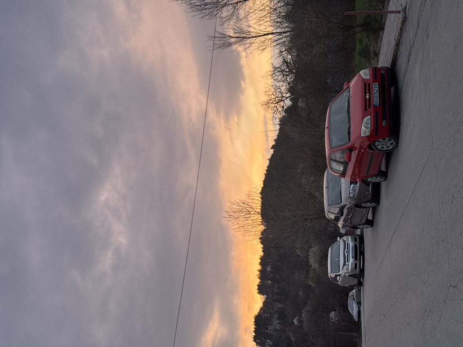 The image depicts a static street scene in the city of Kyustendil, Bulgaria, during twilight hours, characterized by a sunset or sunrise glow. The sky transitions from grey-purple in the upper frame to a prominent orange and yellow band along the horizon. A single dark utility line extends horizontally across the upper middle of the frame. In the foreground, an asphalt road curves slightly to the left. Parked along the right side of this road, parallel to a concrete sidewalk, are four passenger vehicles in a serial arrangement. The closest vehicle to the viewer is a red Hyundai Getz hatchback, bearing Bulgarian license plate KH 0762 KB (Kyustendil registration). Behind it is a grey/brown Dacia Logan sedan. Following that is a silver/grey Toyota Corolla Verso. A fourth silver sedan is partially visible further down the road. No individuals are present. A slender, light-colored post stands vertically on the far right edge of the frame, beside the sidewalk. The midground and background consist of a steep, tree-covered hillside, indicative of mountainous or hilly terrain. The vegetation predominantly features bare deciduous trees and shrubs, suggesting a late winter or early spring season, with some scattered green foliage and small patches of white blossoms. Residential structures are partially visible on the lower slopes of the hill, interspersed among the trees. The scene is devoid of any active movement or interaction.