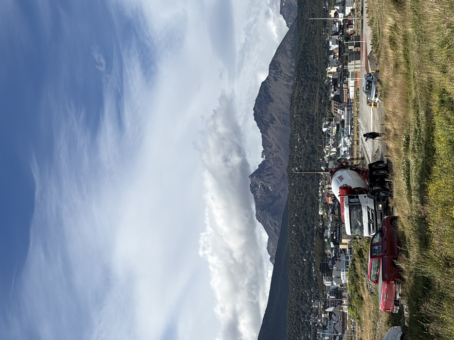 A landscape scene shows a town nestled beneath tall mountains. A blue sky with scattered clouds dominates the view. In the foreground, a concrete mixer truck and a red pickup truck are parked beside a grassy embankment. Above the town, a mountain range rises dramatically, partially obscured by clouds. Buildings of the town are seen in the distant. A parked light-colored SUV can be seen in the upper right.