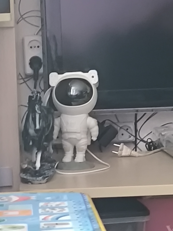 The image depicts an indoor scene in Красный Маяк, Russia, focused on a section of a shelf or desk. A white astronaut-shaped light projector, featuring a dark, reflective spherical visor and small ear-like protrusions, stands centrally on a light-colored surface. A white power cable extends from its circular grey base. To its immediate left is a dark-colored figurine of a rearing animal, possibly a horse or wolf, on a textured base. Behind these items, a large, dark rectangular screen, consistent with a television or monitor, is partially visible. The background includes a light-colored wall with two white electrical wall sockets. One socket on the left wall has a black two-prong plug inserted with associated black cables. Another socket on the back wall shows an unplugged white two-prong electrical plug lying on the shelf surface in front of it, surrounded by a tangle of black and white cables and a dark power adapter. The foreground, below the shelf, partially reveals a blue and yellow object and a dark storage container. No individuals are present in the scene.
