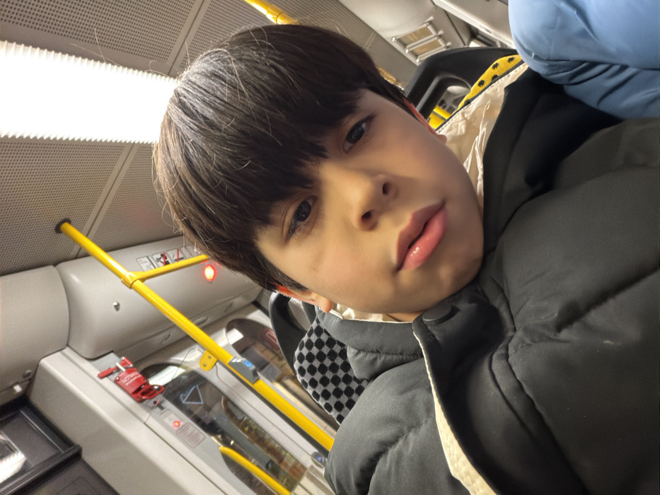 A young boy with dark hair and a puffy jacket is posing for a selfie indoors, seemingly on public transportation