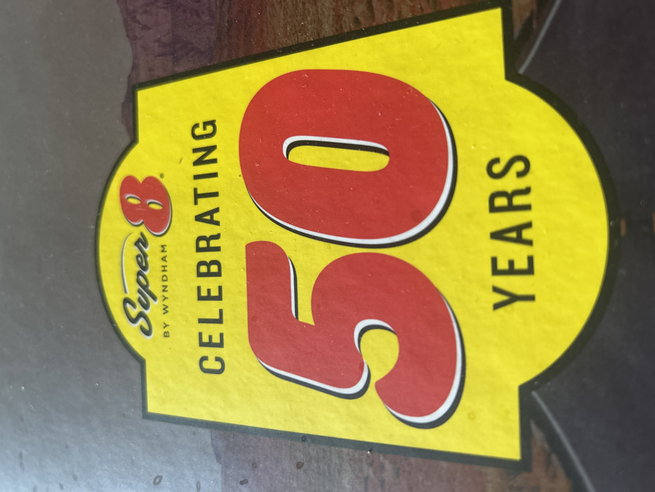 A yellow sign celebrates Super 8 by Wyndham's 50th anniversary