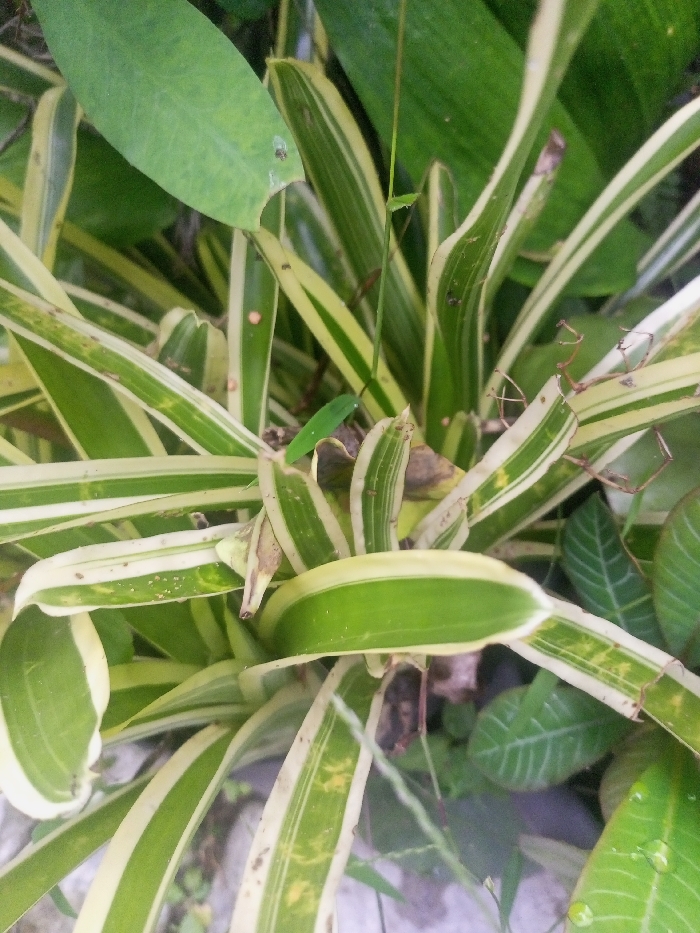 This image depicts a close-up view of dense plant foliage in Zee Pin Kone, Myanmar. The central subject is a plant with numerous elongated, tapering leaves exhibiting distinct longitudinal stripes of green and creamy white. Several leaves show minor brown discoloration or desiccation along their edges and tips. A slender, green insect, approximately 2 centimeters in length, is vertically positioned near the center of the frame, blending with the surrounding vegetation. Other plant matter, including broader, solid green leaves at the top and smaller leaves with visible venation, are present in the background and foreground. Multiple small water droplets are observable on the surface of some leaves in the lower right section. No human subjects, animals other than the identified insect, or man-made objects are visible within the frame.