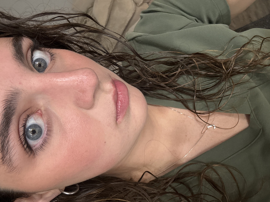 A woman's face fills the frame, tilted at an angle. She has large, light blue eyes and dark eyebrows. Her complexion is fair, with rosy cheeks and full lips. Her dark, curly, wet hair surrounds her face. She is wearing a light green shirt and a delicate silver necklace is visible on her neck. An earring is visible in her left ear.