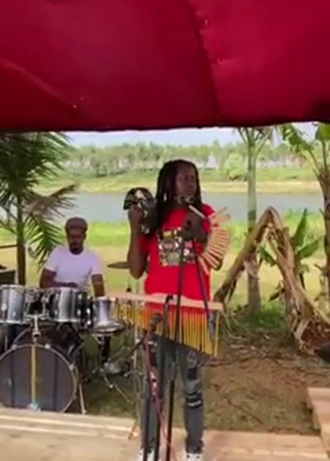 A man with dreadlocks is performing with a band on an outdoor stage. He's playing percussion instruments including a tambourine and shaker, as well as singing. He's wearing a red t-shirt, ripped jeans, and white sneakers. Behind him, a drummer wearing a white shirt and a goatee plays a drum kit. The stage is made of light-colored wood planks and is covered by a red awning. The background features a grassy area with palm trees and a body of water. There are also sound equipment cases visible behind the drum set.