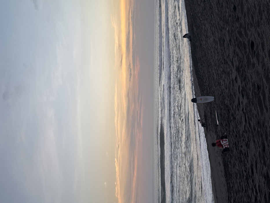The image displays a beach scene at sunset or dusk in the city of Unknown, Unknown