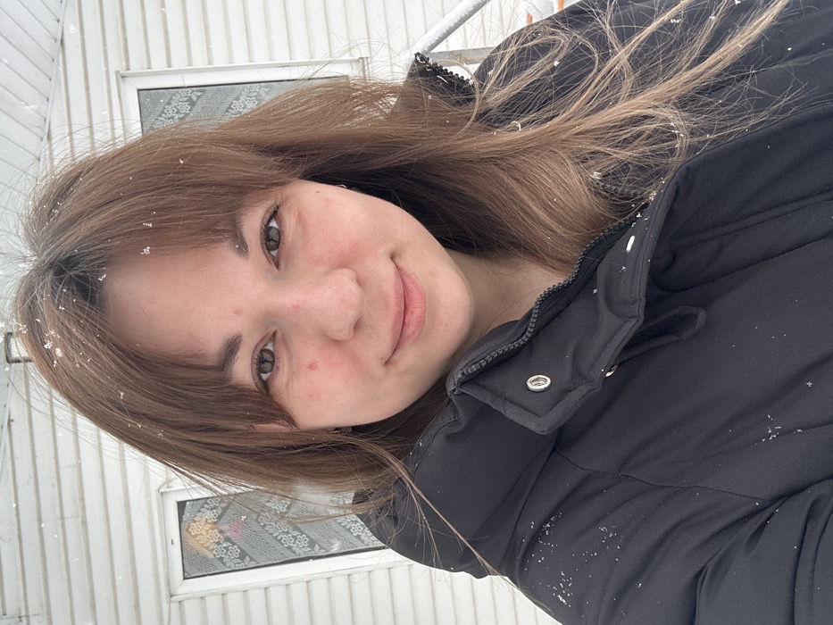 A close-up portrait shows a female subject outdoors in what is identified as the city of Фоки, Russia. The subject, an adult female with light skin, brown eyes, and light brown hair with bangs, looks directly at the camera with a subtle, closed-mouth smile. Her cheeks exhibit a reddish flush. She is wearing a black puffer jacket with a high, partially zipped collar and visible silver snaps. Small hoop earrings are visible in both ears. Numerous small white flakes, consistent with snow, are settled on her hair and jacket. The background features a light-colored building with horizontal siding. Two windows with white frames and patterned curtains are visible behind the subject's left shoulder. A white-colored metal railing, possibly from a staircase or porch, is partially visible to her right, also covered with snow. The scene suggests a cold, snowy outdoor environment.