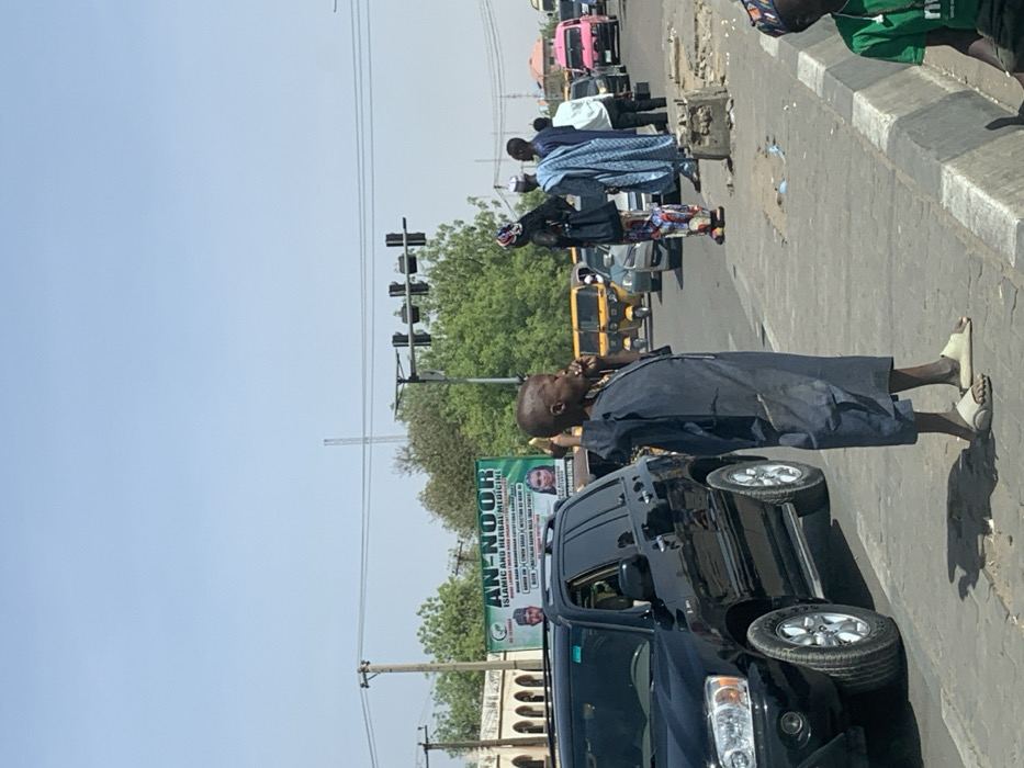 The image depicts a bustling street scene in Hotoro South, Nigeria, under a clear, bright blue sky. In the foreground, a young male, appearing to be a child or adolescent, stands prominently on a light grey concrete sidewalk. He has a shaved head, wears a dark blue or grey, ankle-length tunic, and light beige slip-on sandals. He holds a yellow object, possibly a banana or a small phone, to his right ear. His left arm is bent. To his left, a black SUV, likely a Toyota Highlander, is stopped on the asphalt road. Its front left wheel and part of its side are visible. To the right of the central figure, a concrete curb separates the sidewalk from the road. Part of a person wearing a green t-shirt and cap is visible, seated on the ground in the lower right corner. The sidewalk shows signs of wear, including cracks and debris. In the midground, a multi-lane road extends into the distance, filled with various vehicles. These include several bright yellow commercial tricycles (keke napep), passenger cars, and a distinctive pink bus or van in the far right lane. Several pedestrians are visible on the sidewalk to the right of the central figure: one person in a multi-colored patterned dress and dark headscarf, and another in a light blue patterned long garment. Traffic lights are suspended overhead, controlling the intersection. The background features a large green banner advertising "AN-NOOR ISLAMIC AND HERBAL MEDICINE" with portraits of a male and female. Beyond the banner, green trees and distant buildings are visible, including one with prominent arched windows on the left. Utility poles and power lines crisscross the upper portion of the image, and a tall, thin tower is discernible against the sky in the far distance. The scene is illuminated by strong daylight, casting distinct shadows.