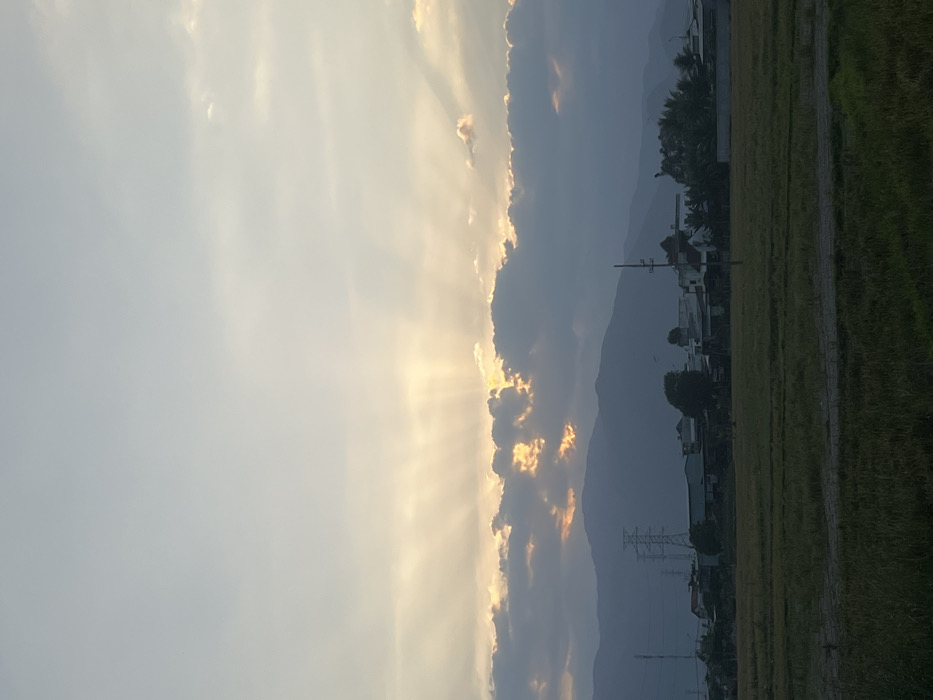 The image depicts a rural landscape at either sunrise or sunset in Diên Khánh, Vietnam. The upper two-thirds of the frame are dominated by a pale blue-grey sky with a warm orange-yellow glow emanating from behind a dense band of dark grey stratocumulus clouds that horizontally bisect the sky. Distinct crepuscular rays are visible extending upwards from the obscured sun through breaks in the clouds. Below the cloud line, a range of dark, silhouetted mountains forms the distant backdrop. In the midground, at the base of the mountains, a cluster of residential and commercial structures with varied roof types, including corrugated metal, is visible. Multiple utility poles and a large metallic lattice electrical transmission tower are interspersed within this developed area. The immediate foreground consists of a flat, expansive agricultural field, likely rice paddies, characterized by various shades of green and brown, suggesting cultivated land. No individuals or active subjects are discernible within the frame.