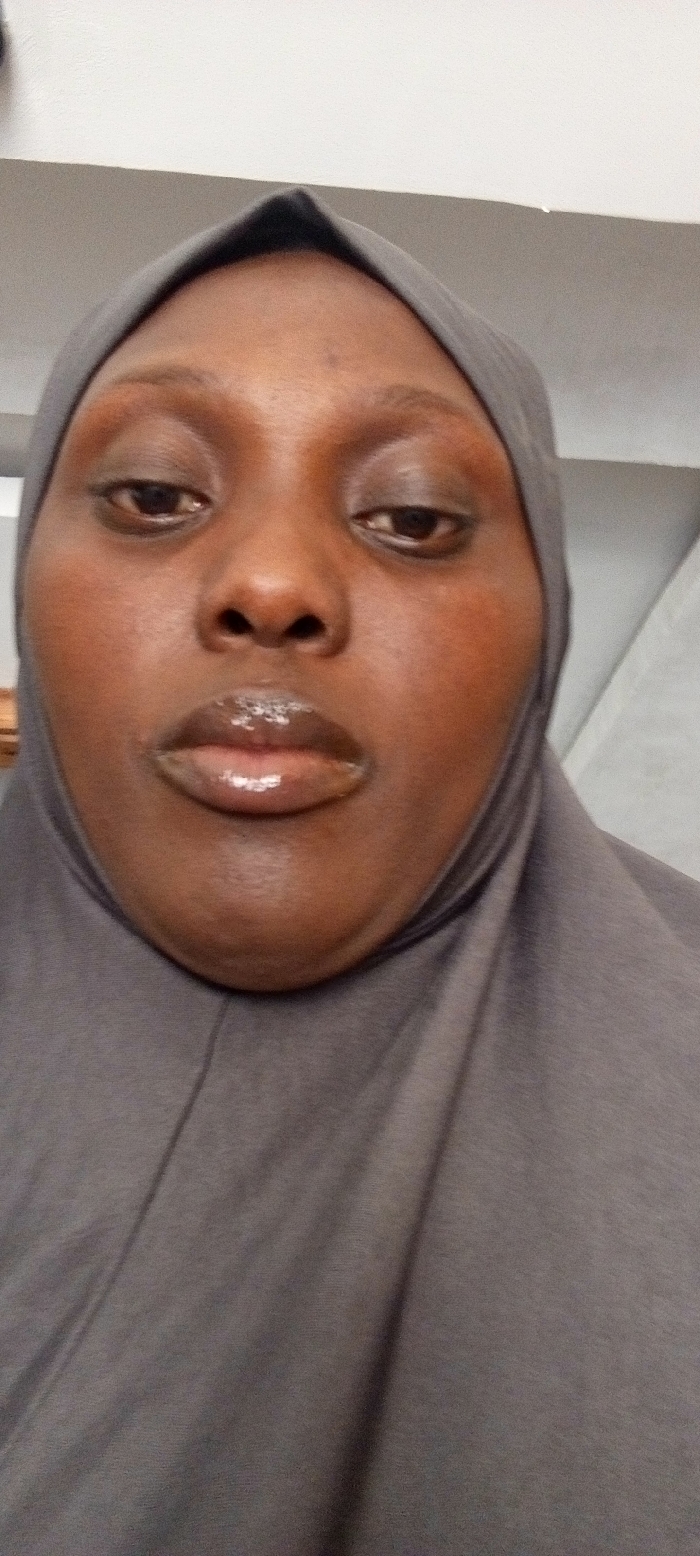 The image presents a close-up, frontal portrait of an individual, likely female, with dark brown skin. The subject is wearing a solid grey hijab, which covers the head, neck, and drapes over the shoulders. The eyes are dark brown and directed straight towards the viewer. The nose is broad, and the full lips exhibit a noticeable glossy finish. The background reveals an indistinct indoor environment, consisting of light grey wall surfaces and a white upper section, suggesting a room corner or wall junction. No other individuals or objects are discernible within the frame. This scene is located in Fagge A, Nigeria.
