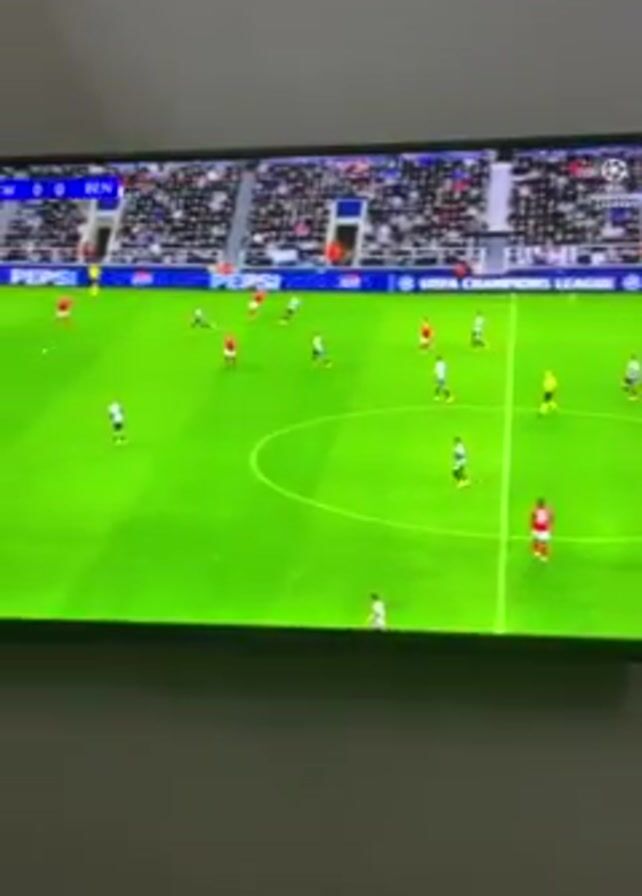 television screen displaying a live soccer match, presumably the UEFA Champions League, with the score currently at 0-0