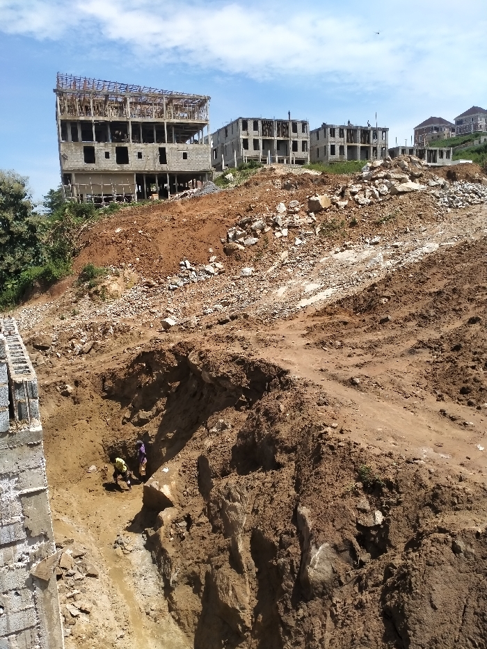 This image captures a construction site on a sloped, excavated landscape in Abuja, Nigeria, under daylight conditions with a partly cloudy sky