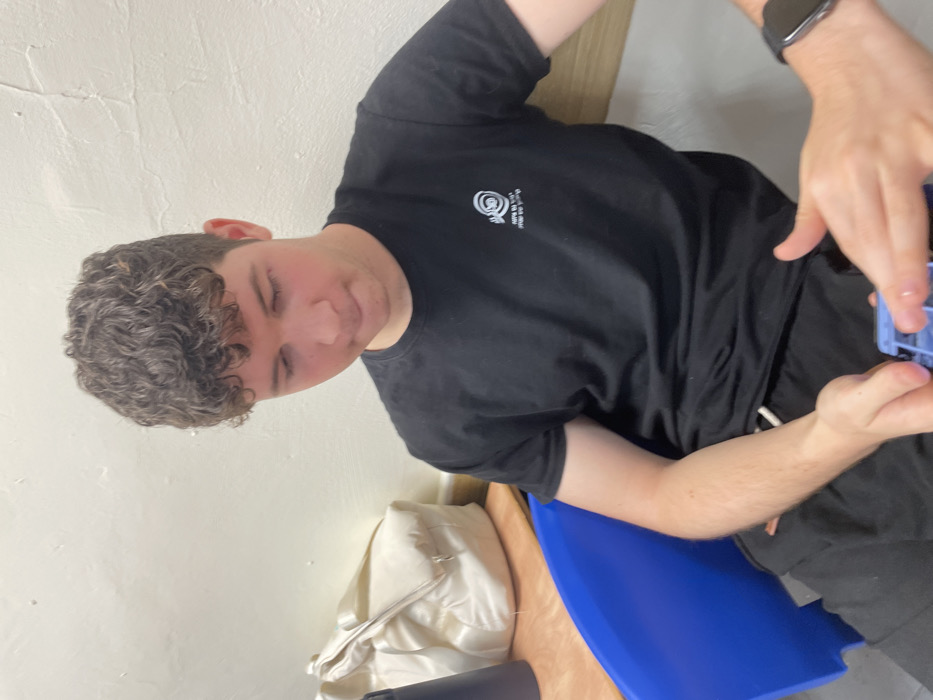 An indoor scene in the city of Unknown, Unknown, depicts one young adult male seated in a bright blue chair. He has light skin, dark curly hair, and is wearing a black short-sleeved t-shirt with a white circular logo and Hebrew text on the left chest, and black athletic shorts with a white drawstring. A dark smartwatch is visible on his left wrist. The male is looking downwards and slightly to his right, with his mouth slightly pursed. He is holding a small, light blue object, resembling a toy or game piece, with both hands. The background consists of a light-colored, textured wall. To the subject's left, a light wooden surface is visible, supporting a cream-colored soft bag and a dark cylindrical object.