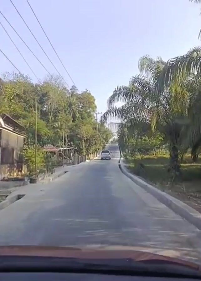 A static camera shot from inside a car looking forward down a grey paved road, at eye level, shows a white car driving away from the viewer in the middle of the road. The road appears to have curbs. On the left side of the road is a wood and tin structure set back from the road behind vegetation and a low fence. Power lines are visible overhead. On the right side of the road are tall palm trees and banana trees. The sky is a bright light blue. The interior of the car is visible at the bottom of the shot. The lighting is bright.