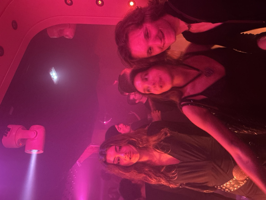 A group of people, seemingly in a nightclub, are captured in a low-lit, hazy atmosphere. Pink and red lighting dominates the scene. Several individuals are visible, with the closest being a woman with wavy brown hair, wearing a black top and a belt with metallic detailing. Further back, there are at least two other women and a man. A spotlight and various ceiling lights cast illumination across the space. The overall mood is that of a lively, dimly lit party setting.