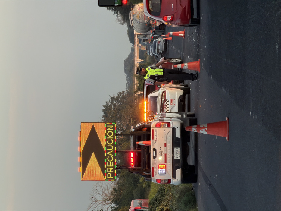 A traffic officer stands near cones, cars, and emergency vehicles. A digital sign displaying "PRECAUCIÓN" with a chevron is attached to a white Nissan Frontier. A white and black car with the number 911 is also visible. Other vehicles and a large tanker truck appear in the distance. The scene is set on a highway.