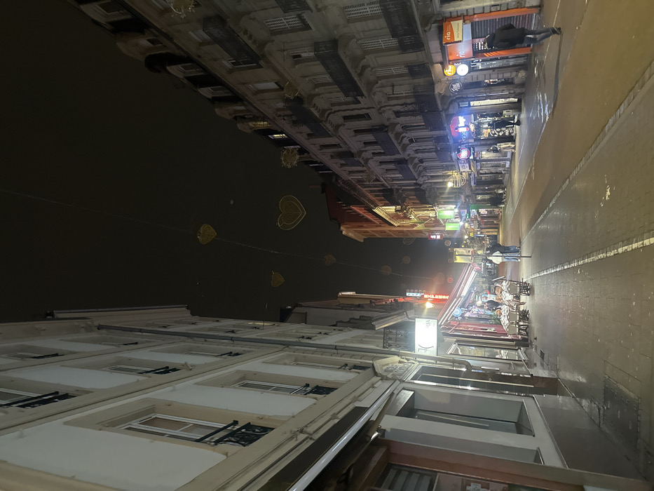 Night scene of a European street lined with buildings. Strings of heart-shaped lights hang overhead. Shops and restaurants illuminate the street, with patrons visible at outdoor tables. The buildings are historic, with ornate details. The perspective is tilted upward, creating an unusual view of the urban landscape. A street stretches towards the horizon, with sidewalks on either side.