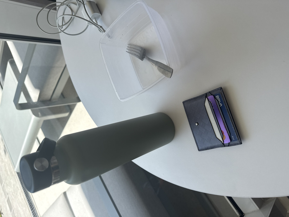 The image presents an indoor scene looking out onto an outdoor patio. On a white, round-edged table, an olive green insulated water bottle with a black cap stands prominently on the left. To its right, a transparent, rectangular plastic container holds a silver metal fork, displaying minor food residue within the container. A coiled white USB charging cable and a white power adapter are situated on the table to the upper right. Below the water bottle, a dark grey cardholder, open to reveal several cards, rests on the table. Visible within the cardholder is a card with "BBVA" and "Azul" branding, indicating a Mexican bank card. The background, visible through a large window, shows a modern outdoor patio furnished with light-colored, low-slung outdoor seating and a matching low table. This setting suggests a contemporary residential apartment or a hotel room with a balcony or terrace, located in the city of Puebla, Mexico.
