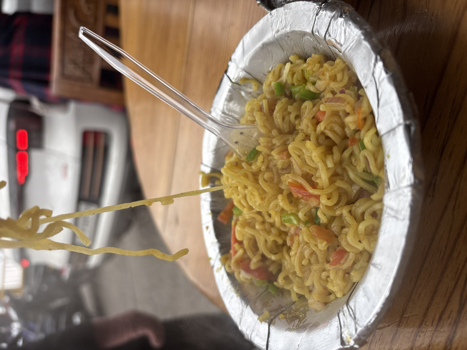 - "The image displays a close-up view of a foil-lined disposable paper bowl containing cooked instant noodles, likely Maggi, situated on a brown wooden table" by FM-LJoZ53, licensed under CC BY 4.0