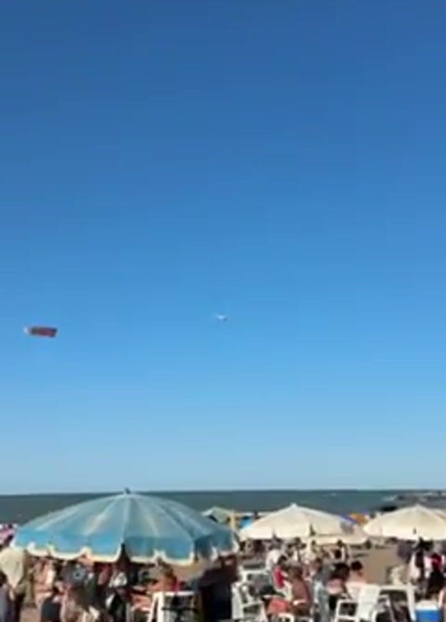 The video depicts a crowded beach on a sunny day. The sky is clear blue, and the beach is filled with people, umbrellas, and chairs. In the sky, a small airplane is flying, towing a banner with red, white and orange coloring. The camera zooms in on the airplane and banner.