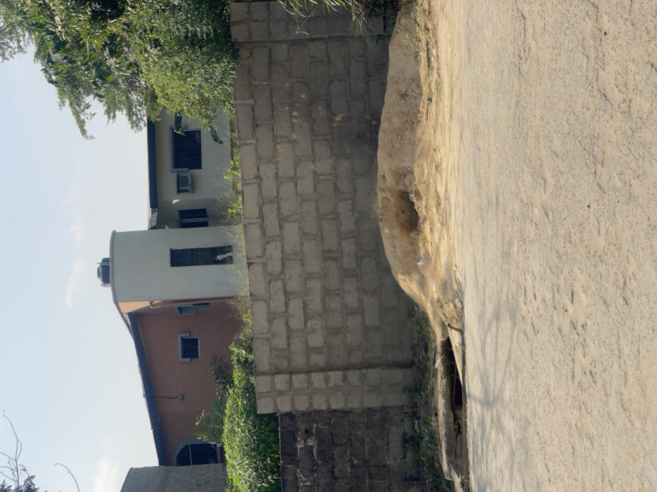 This image depicts a static daytime street view in Ado, Nigeria. The foreground consists of an uneven, light-colored dirt or unpaved road surface. In the mid-ground, a grey concrete block wall with visible mortar lines spans horizontally. To the immediate left of this main wall section, a darker, possibly older, concrete block wall is partially visible. Adjacent to this darker section, at ground level, is an exposed rectangular drainage opening with a dark interior, lacking a visible cover. To the right of the drainage opening and in front of the grey wall, a mound of light brown sand or dirt is present. The background features a multi-component building partially obscured by dense green foliage. The building exhibits varied architecture, including a reddish-brown section with an arched window and a rectangular window, and an adjoining lighter cream-colored section. This cream section includes a prominent cylindrical tower topped with a dark water tank, featuring a tall, narrow vertical window. Further to the right, another cream-colored wall segment is visible with at least two rectangular windows, one fitted with an external air conditioning unit. The sky above is clear and light blue with faint cloud wisps. No individuals or active subjects are present.