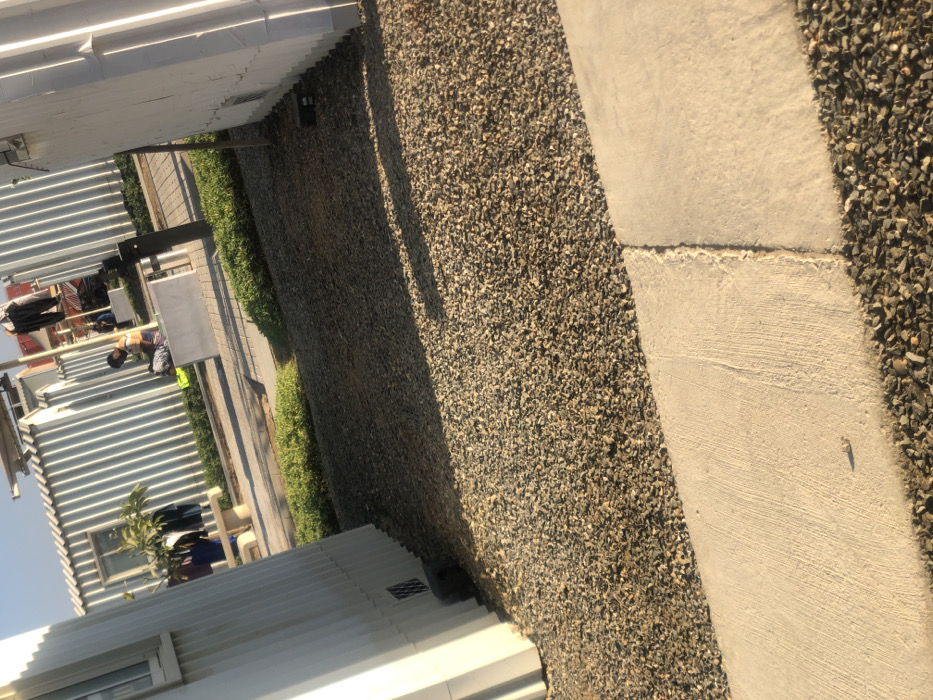 This image depicts an outdoor area within النعيلة, Saudi Arabia, characterized by light-colored, corrugated metal modular buildings. The foreground and mid-ground consist of a gravel surface interspersed with concrete pathways and strips of low green vegetation. Strong sunlight from the right casts distinct shadows across the gravel. In the mid-ground, a paved walkway runs horizontally. Along this walkway, a male individual wearing an orange and dark-striped shirt is kneeling or seated on the ground adjacent to a white rectangular bench. This person appears to be focused on an object or activity directly in front of them on the ground. Another individual in dark clothing is partially visible further in the background, near other modular structures. Additional white benches are situated along the walkway, and a dark vertical post is present near one. In the far background, dark clothing items are observed hanging on what appears to be a clothesline or rack.