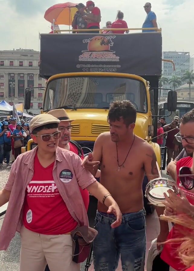 A group of people dances and plays percussion instruments at a street event. A yellow truck with a banner on top is visible in the background. The dancers wear red t-shirts with the word "SINDSEP" printed on them. A shirtless man dances with a tambourine in his hand. There's a mix of men and women in the group. Other event attendees and tents are visible in the background. The event takes place in an urban area with buildings and a partly cloudy sky.
