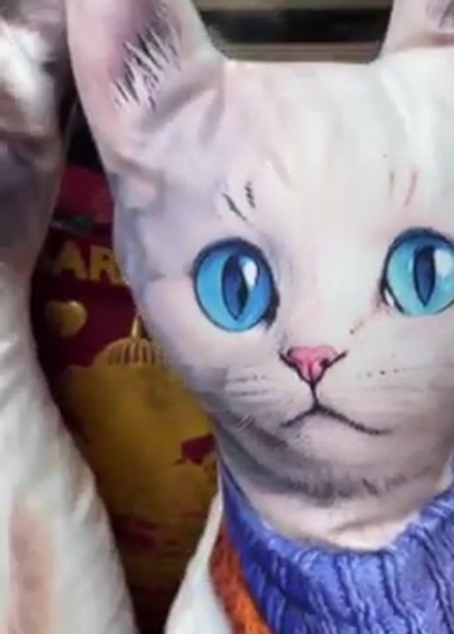 The video showcases a display of cat-shaped pillows in a store window. These pillows are printed with realistic cat faces and bodies, some even wearing clothes. The camera pans across the display, showing various breeds and colors of cats. The window display also contains other decorative objects.