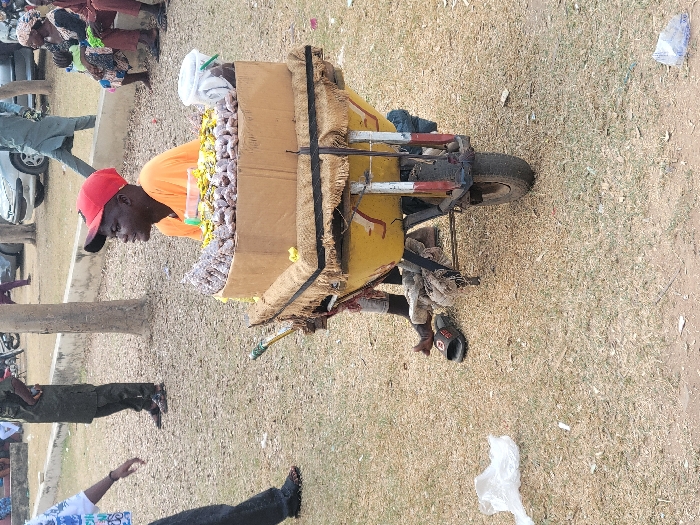 In Kwali, Nigeria, a young man sits behind a yellow, modified wheelbarrow in an open, dry, grassy area, potentially a marketplace