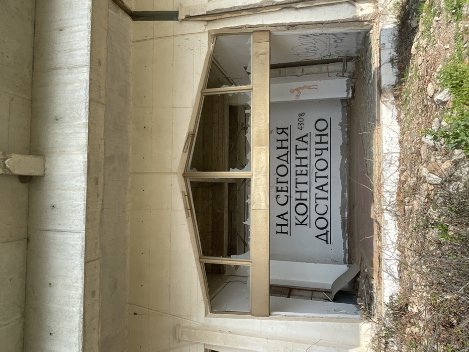 The image depicts the exterior of an abandoned or unfinished concrete structure in Perazića Do, Montenegro