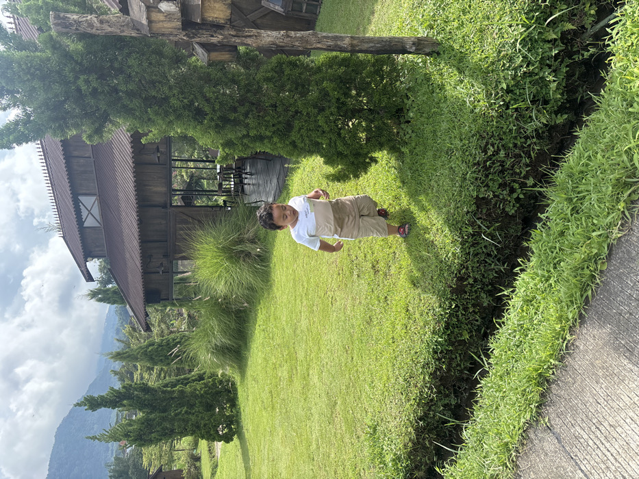 A young boy, wearing a white shirt and khaki shorts, stands on a grassy lawn. A wooden building with a dark roof is visible in the background, partly obscured by a tall, green tree. Additional greenery and a paved path line the edge of the grass. The sky above is partially cloudy. Mountain is visible on the distance. The overall scene depicts a peaceful, outdoor setting.