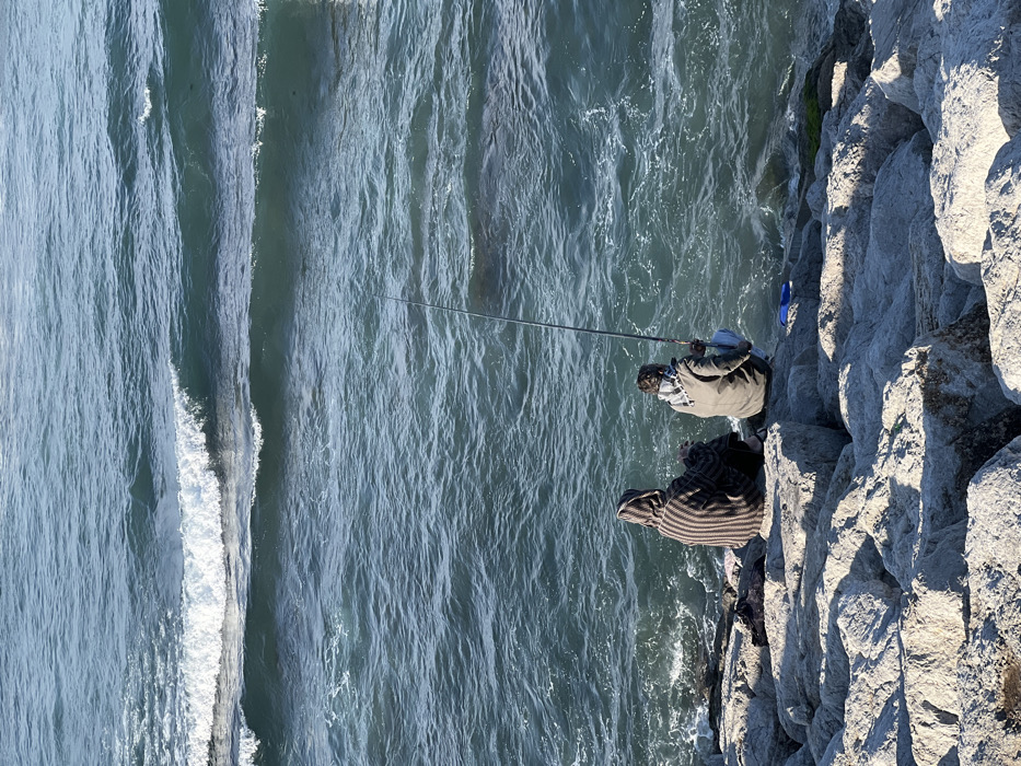 Two individuals are seated on large, light-grey rocks along the coast of Tanger, Morocco, facing the sea. The individual on the left wears a hooded garment with vertical brown and light-colored stripes. The individual on the right, dressed in a khaki-colored hooded jacket and blue jeans, holds a long fishing rod extending into the dark blue-green water. A small blue container object is visible on the rocks near the right individual, and a dark fabric item rests on the rocks near the left individual. The sea displays moderate wave action, with white foam visible from breaking waves, particularly closer to the rocky shoreline. The scene is illuminated by natural daylight.