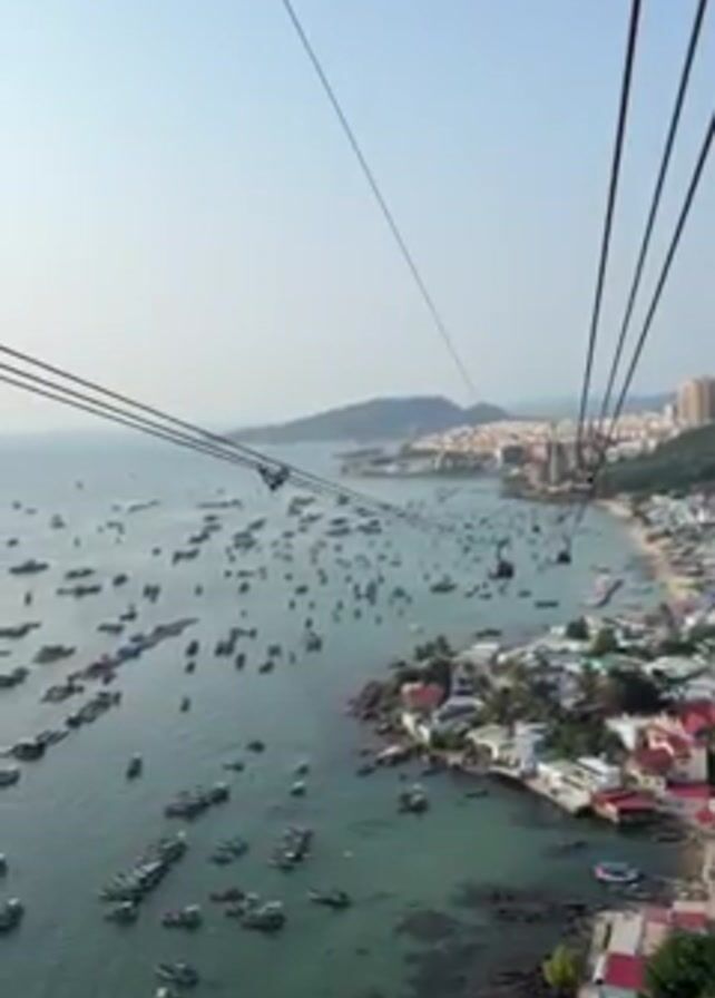 n aerial view of a coastal area with many boats in the water, taken from a cable car. The cable car's wires are visible in the foreground. The water is a clear turquoise color. There are buildings on the coast, including some red-roofed structures. In the background, there is a town with taller buildings on a peninsula. The sky is bright blue and clear.