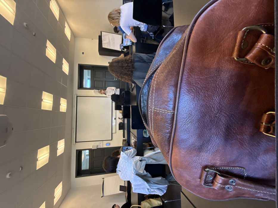 The image depicts an indoor classroom or conference room, located in Florence, Italy. The vantage point is from behind a large, reddish-brown, textured leather bag with white stitching and brass hardware, occupying the lower half of the frame and resting on a dark table in the foreground. In the midground, several individuals are seated at dark tables, facing the front of the room. Their backs or sides are visible. Attendees include a person with dark, short hair wearing a white patterned top, a person with dark, curly hair, and a person with light, shoulder-length hair wearing a white t-shirt, all utilizing laptops or tablets on their desks. Two white flip charts or whiteboards on stands are positioned on either side of the main presentation area. At the front of the room, a young woman with light hair, dressed in a light-colored turtleneck and dark trousers, stands facing the seated audience, appearing to deliver a presentation. Behind her is a large, blank white projection screen. The screen is flanked by two tall, dark wooden double doors with paneled designs. The room has light-colored walls and a ceiling featuring multiple recessed rectangular light fixtures and a centrally mounted projector.