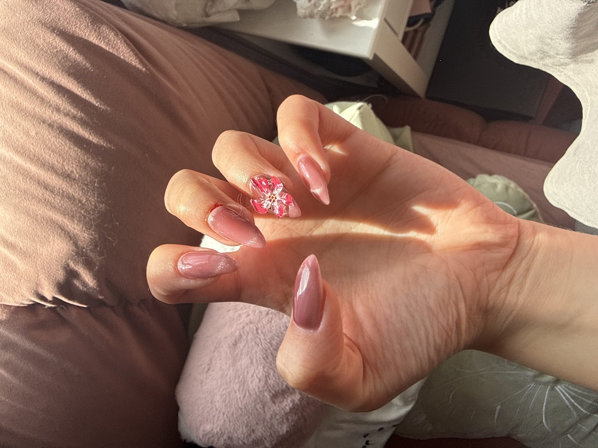 A right hand with manicured nails is the focal point of the image. The nails are painted in a glossy, light mauve color with glitter accents, except for the index finger, which is adorned with a three-dimensional, intricate pink and white flower design. The hand is positioned against a soft, blurred background that includes a large, rose-colored pillow and a white object that appears to be furniture. The scene is illuminated by warm, natural light, casting shadows that highlight the textures of the skin and fabrics. The image shows the hand in a relaxed state. The location in Kazanlak, Bulgaria, is not discernible from the image.