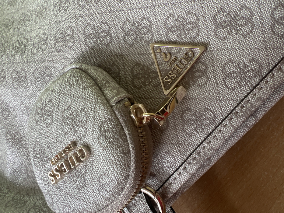 A close-up, high-angle view depicts two light-colored Guess brand items resting on a light brown wooden surface. The central object is a small, rounded pouch or coin purse, constructed from a textured light beige material with a repeating "4G" logo pattern. Raised, gold-toned metal letters spelling 'GUESS' and 'EST. 1981' are affixed to its front. A gold-toned metal zipper secures the pouch, featuring a matching zipper pull. Attached to this pull is a triangular, gold-toned metal charm displaying the 'GUESS USA ?' logo. The pouch lies on a larger, flat surface made of the identical patterned material, possibly a matching bag, exhibiting dark stitching along an edge in the lower left. No individuals or specific environmental markers for Veliko Tarnovo, Bulgaria, are present in the image.