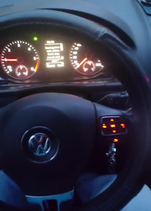 The interior of a Volkswagen is shown in the video. The dashboard is lit up, displaying information such as "Steering inter...active, Check assist, Check speed, Check area" and a mileage reading of 188.3. The steering wheel is black with the VW logo in the center, and has buttons on the right side. The person filming is sitting in the driver's seat, wearing jeans.