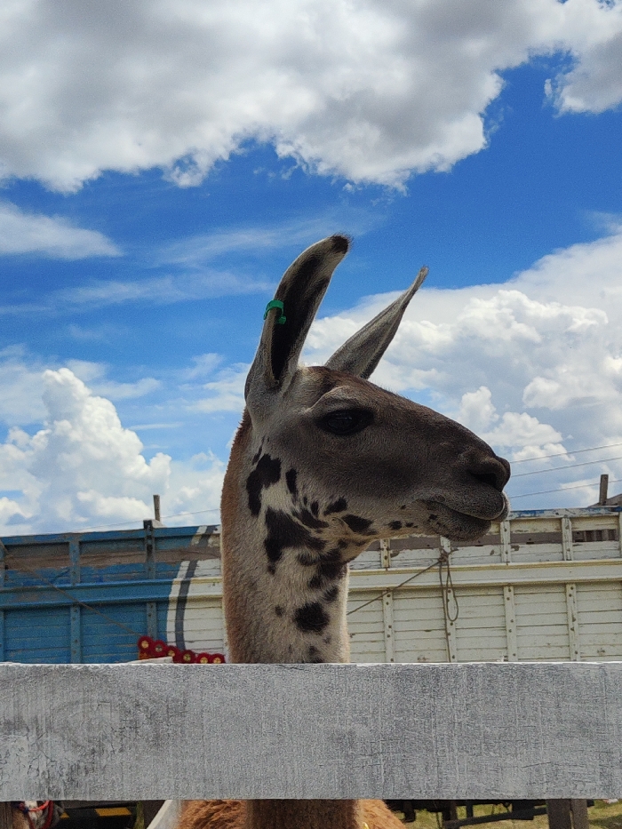 A llama stands behind a low, weathered white fence. The llama has light brown fur with dark brown spots on its neck and head, and a green tag on its ear. The sky behind the llama is bright blue with fluffy white clouds. The back of a truck, with a faded blue and white design, is visible behind the fence. A glimpse of another animal can be seen in the lower left corner.