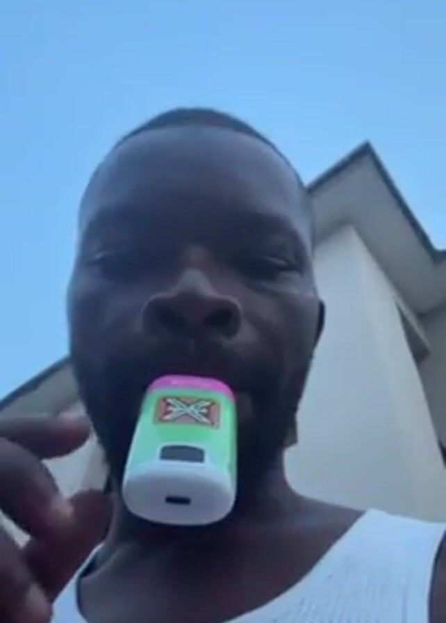 A man is holding a light-up device in his mouth in a selfie-style video. He is Black and wears a white tank top. He is outside with a building and a light blue sky visible in the background. The device in his mouth is emitting a red and yellow light. The device is white with green, pink and black markings. He looks directly into the camera.