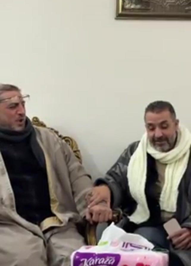 Two men are sitting next to each other, holding hands, and talking. The man on the left is wearing a brown robe and glasses. The man on the right is wearing a grey robe and a white scarf. There is a box of tissues on a table in front of them. A framed picture is hanging on the wall behind them. The men appear to be in a domestic setting.