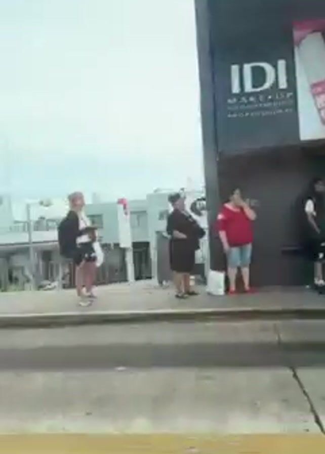view from inside a moving vehicle. The camera is facing out the side window, capturing the urban environment. Initially, the camera passes by a bus stop with a large advertisement featuring the Argentine flag and text. People are visible at the bus stop. The vehicle then passes along a street with trees, buildings, and traffic barriers. Finally, a yellow bus with the words "AZUL SATA" on its side is seen passing by.