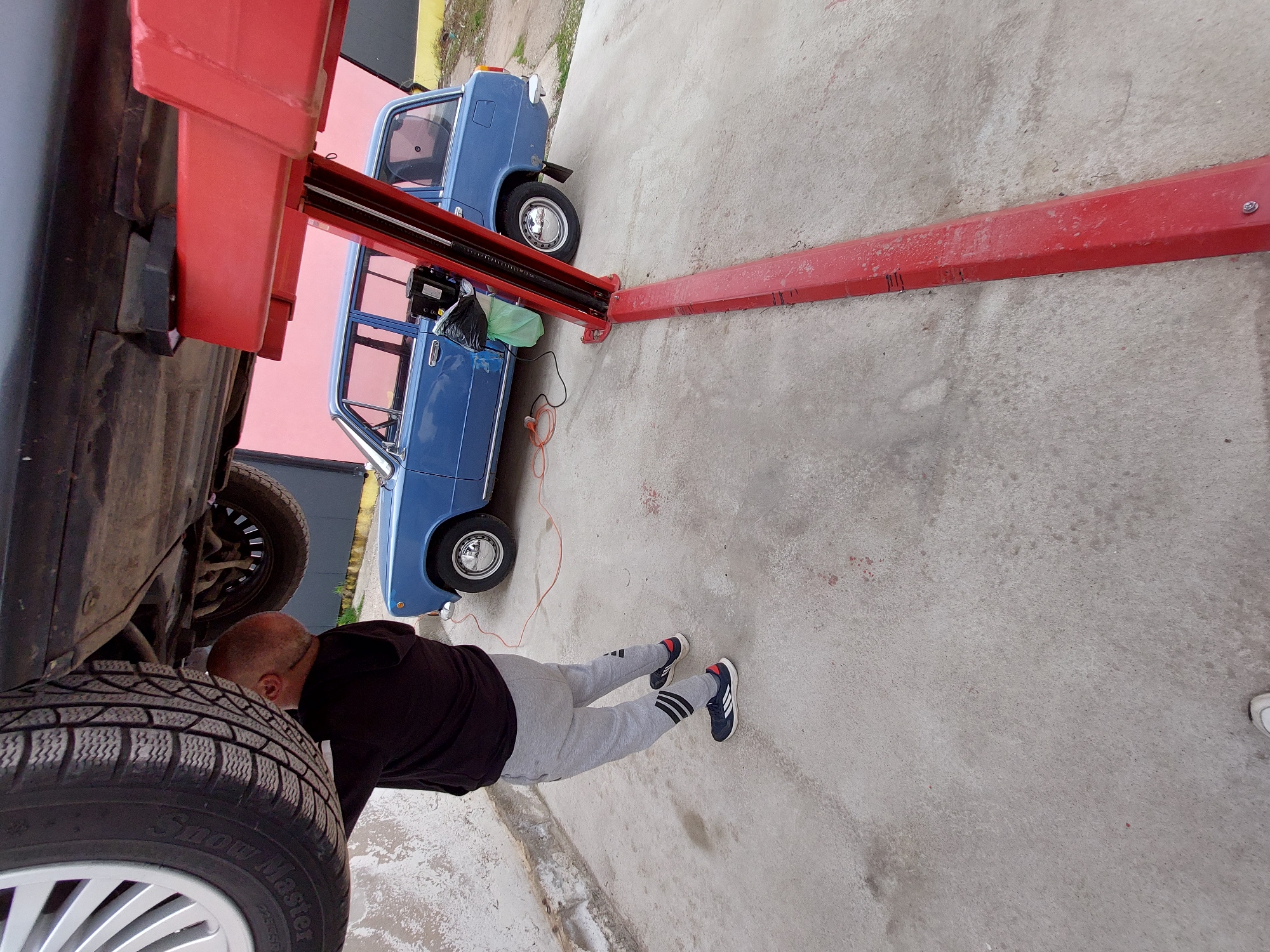 person lying on their back underneath a car that is raised on a red hydraulic lift. The person is wearing a black shirt, grey sweatpants with Adidas stripes, and blue sneakers. A second blue car is visible adjacent to the lift. The ground is concrete. The tire of the lifted car has the brand name "Snow Master" visible. The location is outdoors in what appears to be a repair shop, potentially in the city of Vratsa, Bulgaria.