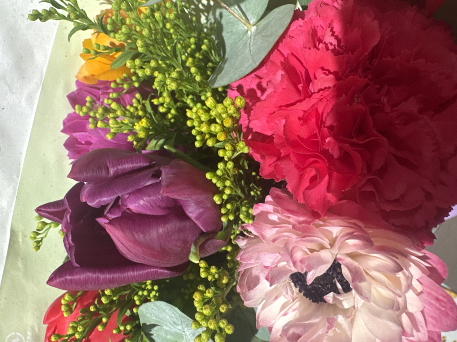 A vibrant bouquet bursts with color and texture. A deep purple tulip is juxtaposed against a bright pink anemone with a black center. A large, ruffled carnation in crimson red dominates the upper right. Sprigs of small, clustered yellow flowers intermingle with the blooms. A few eucalyptus leaves add a subtle touch of silver-green. Hints of orange and magenta peek from beneath, completing the arrangement's lively palette.