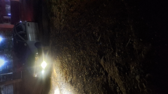 The image depicts a nighttime scene in Tinaco, Venezuela. A light-colored hatchback or small SUV, possibly silver or white, is parked on an unpaved, gravelly surface. Its headlights are fully illuminated, casting bright light directly forward and onto the immediate ground, creating significant glare. The driver's side door of the vehicle is open. No individuals are visible in the frame. In the background, indistinct structures and fencing are dimly lit by artificial light sources. A section of a red wall is visible to the far right. The overall environment is dark, suggesting a rural or residential street without extensive street lighting beyond what is visible.