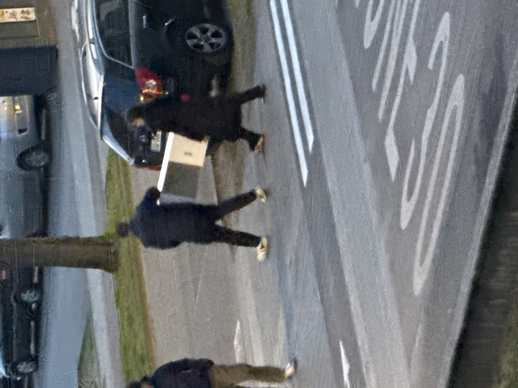 This image depicts an outdoor street scene within the city of Strasbourg, France. The specific street or district is not identifiable from the visual information provided. The scene is viewed from an elevated perspective, looking down onto a paved asphalt road, an adjacent sidewalk, and a grassy area beyond. In the foreground, partial white road markings are visible on the asphalt, including the word "STOP" and two parallel white lines forming a pedestrian crossing further into the scene. A white triangular arrow marking is also present on the left side of the road near the crossing. Three individuals are walking from left to right across the frame, with their backs predominantly facing the viewer. 1. The leftmost person wears a dark jacket and light-colored trousers, with light-colored shoes. 2. The central individual, positioned on the pedestrian crossing, is dressed in dark clothing (likely a jacket or coat) and light-colored shoes. This person is carrying a large, rectangular, light-colored object, possibly a box or flat package, horizontally with both hands in front of their torso. 3. The rightmost individual, slightly behind the central figure, also wears dark clothing and appears to have light-colored footwear. To the right of the pedestrian crossing, a dark-colored SUV or station wagon equipped with roof rails is parked, facing away from the viewer. Its rear red taillights are visible, and a partial license plate displaying "DB-006" is discernible. In the background, beyond the parked vehicle, a light-colored vehicle (possibly a minivan or SUV) is partially visible on another street or parking area. A tree trunk stands on a grassy strip located between the immediate road and the background area. The overall lighting suggests daytime conditions.