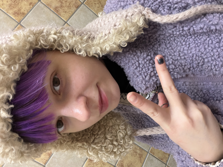 A close-up, chest-up portrait shows one individual looking directly at the camera within an indoor tiled environment. The subject has fair skin, brown eyes, and short, bright purple bangs visible beneath a beige, curly-textured earflap hat. They are wearing a black high-collared garment under a light purple, textured fleece zippered jacket. The subject's left hand is raised, forming a V-sign with the index and middle fingers extended. A silver-colored ring is present on the ring finger of the left hand, and the thumbnail displays smudged dark nail polish. The background consists of light brown and beige square tiles arranged in a grid pattern. The location in the city of Unknown, Unknown, is an indoor tiled space.