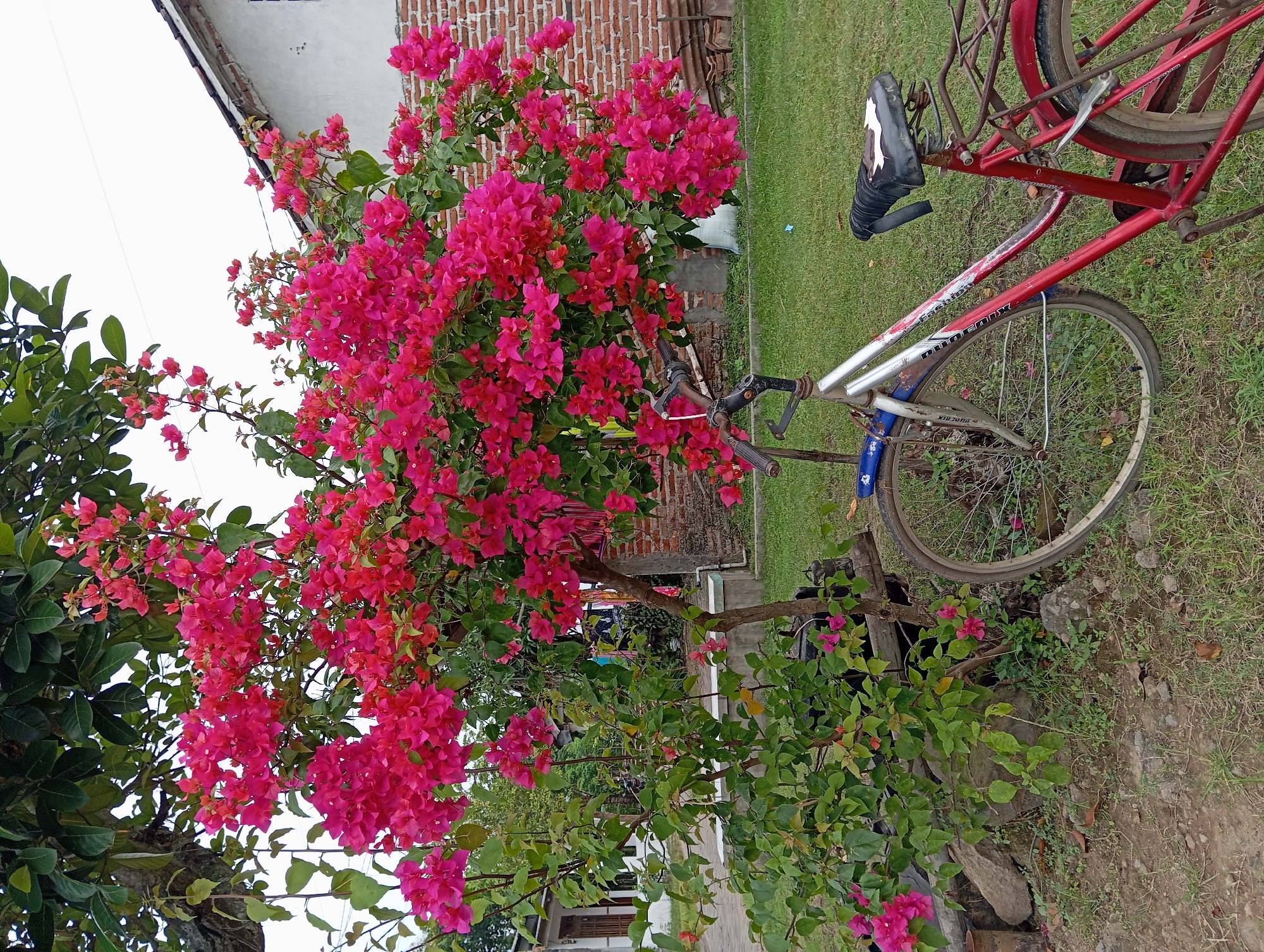A red and silver bicycle is parked in front of a densely blooming bougainvillea bush with vibrant fuchsia flowers in Baron, Indonesia. The bicycle features a red frame with a black seat, a silver front fork, and a blue front fender. Its handlebars are black, and a metal rack is present over the rear wheel. The bicycle rests on a patch of green grass. Behind the bicycle and partially obscuring it is the large bougainvillea bush, rich with bright pink bracts and green foliage. To the left of the bougainvillea, a rough dirt patch with scattered rocks and sparse vegetation is visible. In the background, beyond the grass, are residential structures. A house with white-painted walls and a visible portion of a tiled roof is on the right, partially constructed with exposed red brick. Further to the left, another white building with a dark roof and a brown door is discernible, partially hidden by trees and shrubs. The sky above is overcast and bright, suggesting daytime conditions. No individuals are present in the scene.