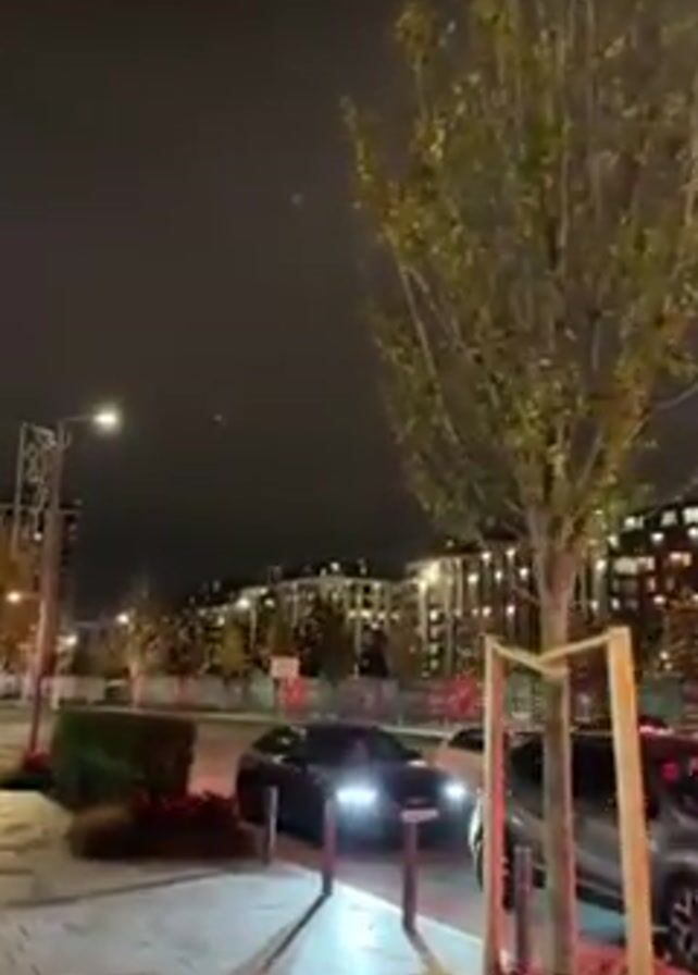n urban street scene at night. Several cars are driving on the road. A line of modern buildings can be seen in the background, decorated with Christmas lights. A row of trees lines the sidewalk. Streetlights illuminate the scene. The sky is dark and overcast.