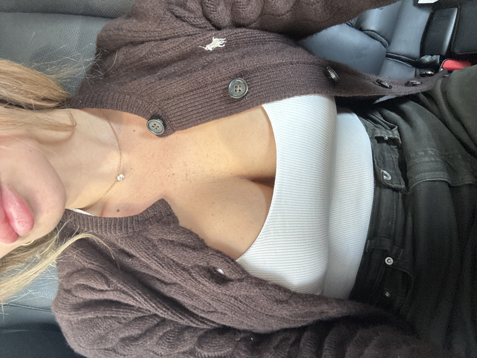 The image depicts a close-up, chest-up view of an individual, likely female, situated in the interior of a vehicle. The person has blonde hair, with the lower portion of their face visible, including full, light pink lips and the chin area. A small gold-colored hoop earring is present on the visible earlobe. Around the neck, a delicate gold-toned chain necklace features a single clear, round gemstone pendant. The individual is wearing a dark brown, cable-knit cardigan with visible texture and three dark, round buttons on the right side. A small, light-colored embroidered logo resembling a polo player on horseback is visible on the right chest area of the cardigan. Beneath the cardigan, a white, ribbed tank top or camisole is worn, revealing cleavage and a distinct tan line across the upper chest. Below the waist, dark-colored trousers or jeans are visible, featuring a silver snap button or rivet near the waistline. The background consists of a dark, textured surface, consistent with an automobile interior, specifically a car seat. The lighting appears soft and even, suggesting an indoor or shaded environment. No specific location within Rishon LeZion, Israel, is discernible from the visual content of the image.