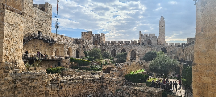This image depicts an exterior view of the Tower of David Citadel in the Old City of Jerusalem, Israel