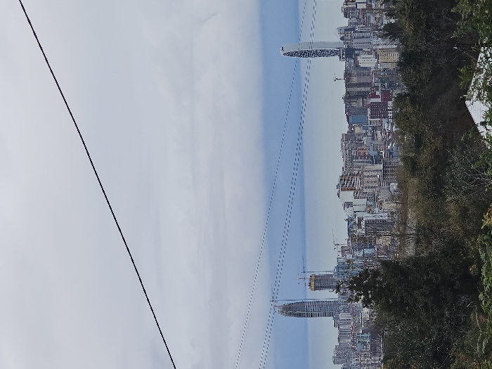 A panoramic cityscape is viewed from a slightly elevated, tree-lined position. Tall buildings define the skyline, with a distinct, patterned skyscraper catching the eye. Power lines diagonally bisect the image, juxtaposing the modern urban landscape against the natural sky. The sky transitions from clear to slightly cloudy. Construction cranes dot the cityscape, suggesting ongoing urban development.